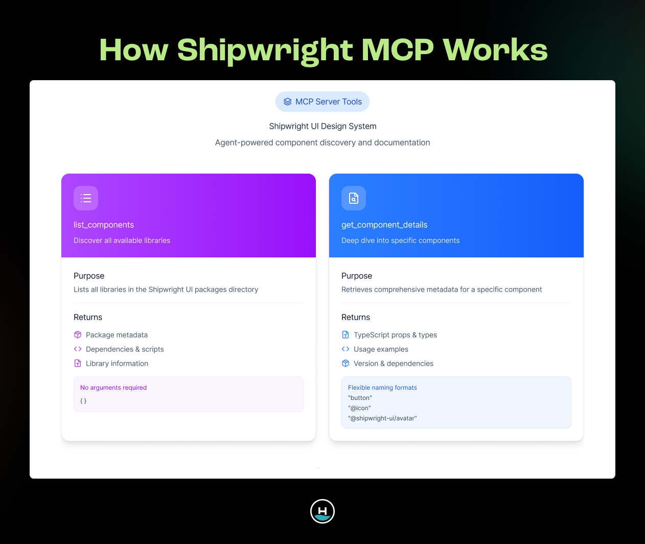 Our custom Shipwright MCP uses two simple tools to deliver accurate results.