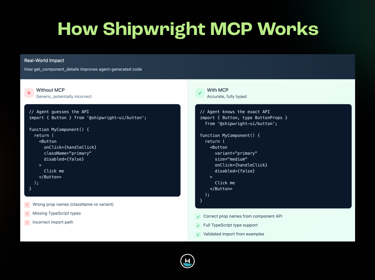 The agent sees you need a menu item. It checks Shipwright MCP and learns there's a MenuItem component with specific props. It suggests implementation using that actual component instead of guessing with generic HTML.